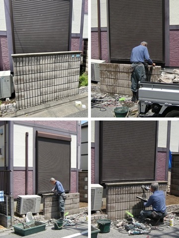 笠木(傘の部分)を一旦取除き、ブロックを2段撤去したうえで、モルタルで接着し直しました。